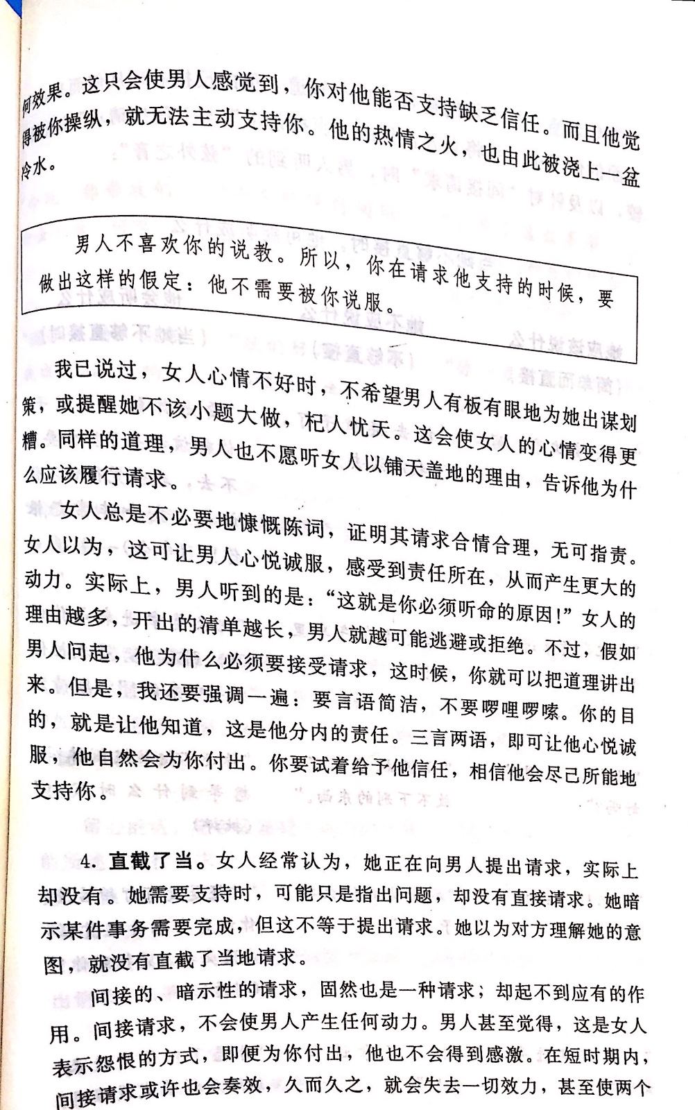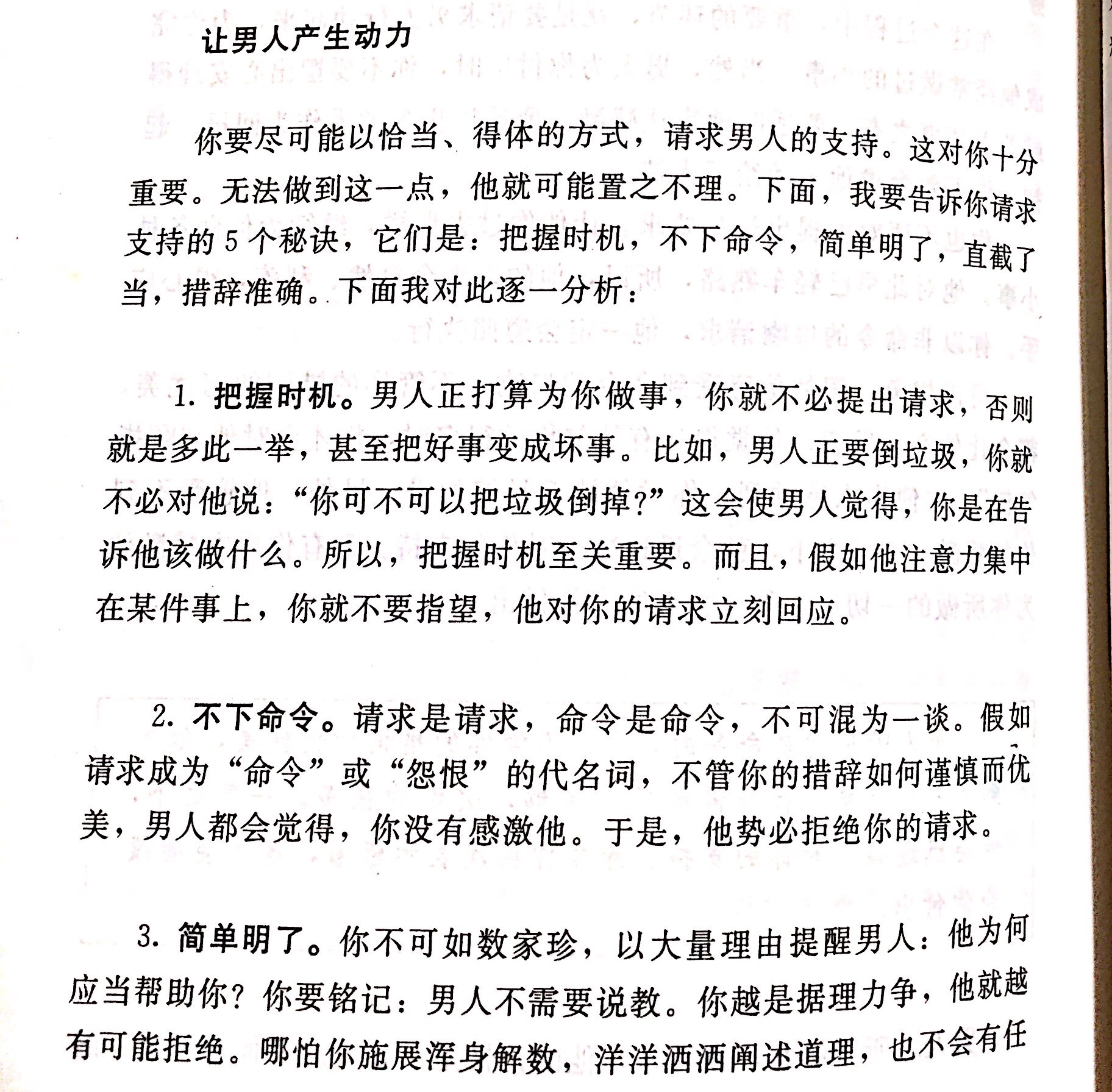 小伙伴可能注意到拆页讲的方法主要是针对女性的,其实在实际运用中向把握时机和请求而非命令同样适合男士。也有的伙伴可能说干嘛不直接用命令呢,我们有时候一高声对方马上就去做了,这不也挺有效吗?我想说虽然结果一样,但对方肯定不是心甘情愿。有时他是迫于你的威胁,有时他是不想听你继续“唠叨”,这些情况都不利于后续求助。