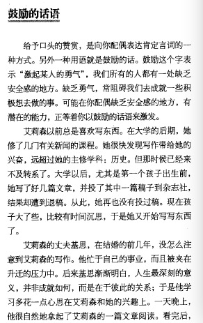 这个片段选自《爱的五种语言》爱的语言之一:肯定的言词中“鼓励的话语”部分。这部分重点讲了如何通过鼓励的话去激发伴侣潜在的能力。