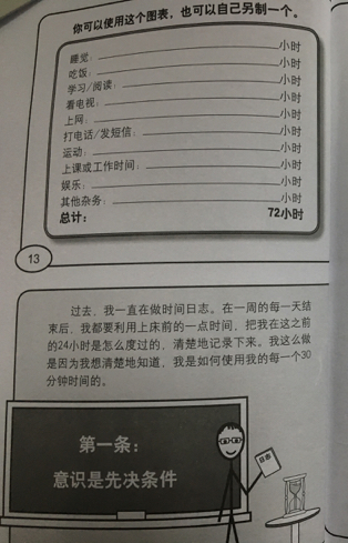 拆书家提问设计(逐字稿):你对时间的感觉是什么样的呢?请在我读出的这些词语中选出最能表达你对时间的感觉,无奈、无所谓、兴奋、感激、紧张、焦虑、悲伤……然后再请大家看看拆解片断中的时间日志表格,回顾一下最近的这72小时你是如何度过的,用最快的速度填写一次,注意在填写前请大家先估算一下写这个日志所需要的时间?并记下估算的时间和实际完成的时间,然后在小组内分享你的感受。