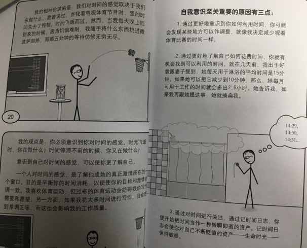 (F)这本书的作者认为“少即是多”,从大量关于时间管理的书籍和文章中归纳出约50条原则,在书中以故事的形式来介绍时间管理。(A)有太多的作家、思想家和研究人员倾向于使用10个词去表达用5个词就可以说明的问题。而这本书集各家之精华,像PPT演示一样内容简而精,大概一个小时就可以读完。(B)虽然时间管理对于一个人的成功来讲是一个关键因素,但那并不意味着良好的时间管理者总是在忙一个又一个活动。也存在这种情况,你会去做你喜欢做的事情,包括悠闲的骑着自行车去一些地方闲逛。这本书会让你最大限度地利用自己的时间,而不是放弃散步、发呆。如果你想对时间管理有更好的了解,让实现自己的目标的可能最大化,都可以花上仅一个小时的时间来阅读这本图文并茂的书,相信你会受益匪浅。为何人在等待的时候会觉得时间过得特别慢?为何人在做自己的喜欢做的事情时会觉得时间过得特别快?为何老有人