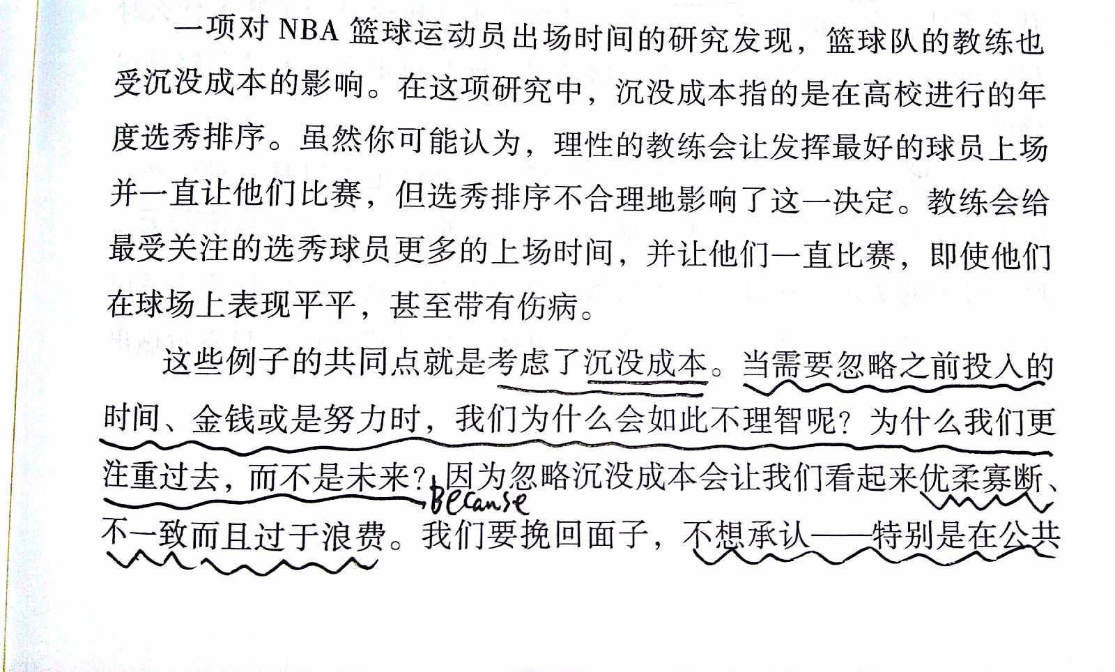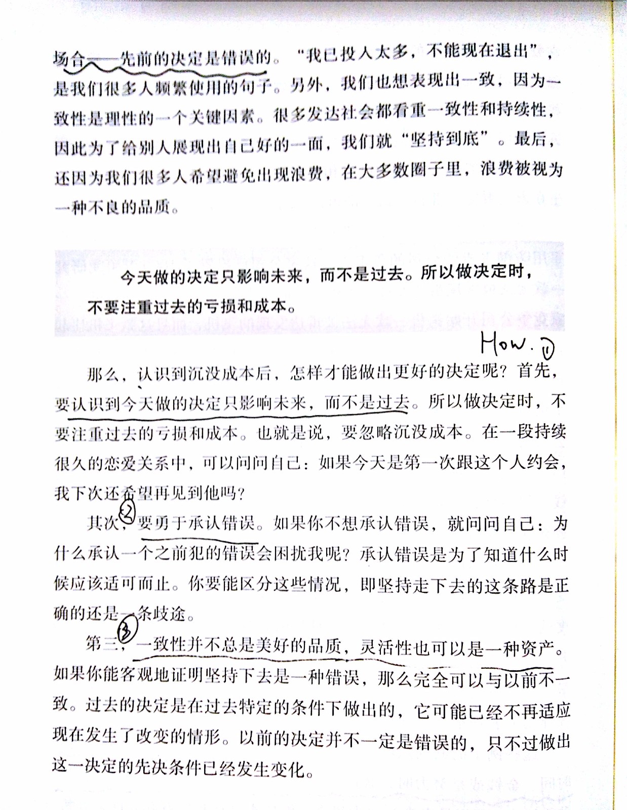 刚才这个片段大家都已经阅读完了是吗?好的。这个片段主要是围绕着一个经济学名词“沉没成本”来谈的,人们在决定是否做一件事情的时候,不仅仅是看这件事情未来对他是不是有好处,同时也会注意自己是不是在过去,已经在这件事情上面有过投入,这是一种非常有趣而顽固的非理性的心理陷阱,我们称之为沉没成本,也叫协和效应。举个例子,有个朋友买了张IMAX高价电影《变形金刚》,票价160元。在他准备出门的前一个小时,他觉得非常不舒服,而且有点恶心,他不想坐半个多小时的车并在那坐两个多小时、吹着很冷的空调看电影,他真正想要的舒舒服服躺在床上休息,但是他强迫自己去看了电影。他说:“我都花了160元买票了,我不想浪费钱”。这时他做出了一个不理智的决定,这个决定受到了沉没成本的影响。如果他足够理性的话,他只要根据未来的后果来做决定就好,已支付的票款不应左右他做这个决策。然而,他把这种不能退还的支出看成当前的投资,而事实并非如此。如果我们考虑未来的收益和成本,而不是过去的成本的话,我们将会作出更有效的决策。为什么? 今天作出的决定只能影响未来,当前的任何决定都无法纠正过去。