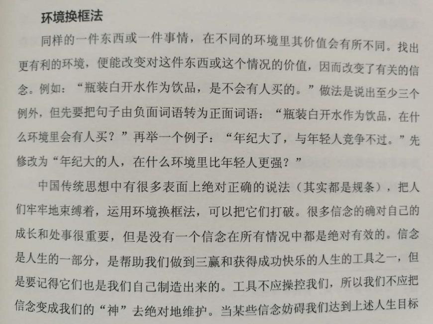 书中举了一个例子,父亲认为女儿太固执了,然后当NLP大师问:如果你女儿和陌生男人出去的时候,那男的有过分的要求,你要不要你女儿固执一点呢?父亲恍然大悟。
