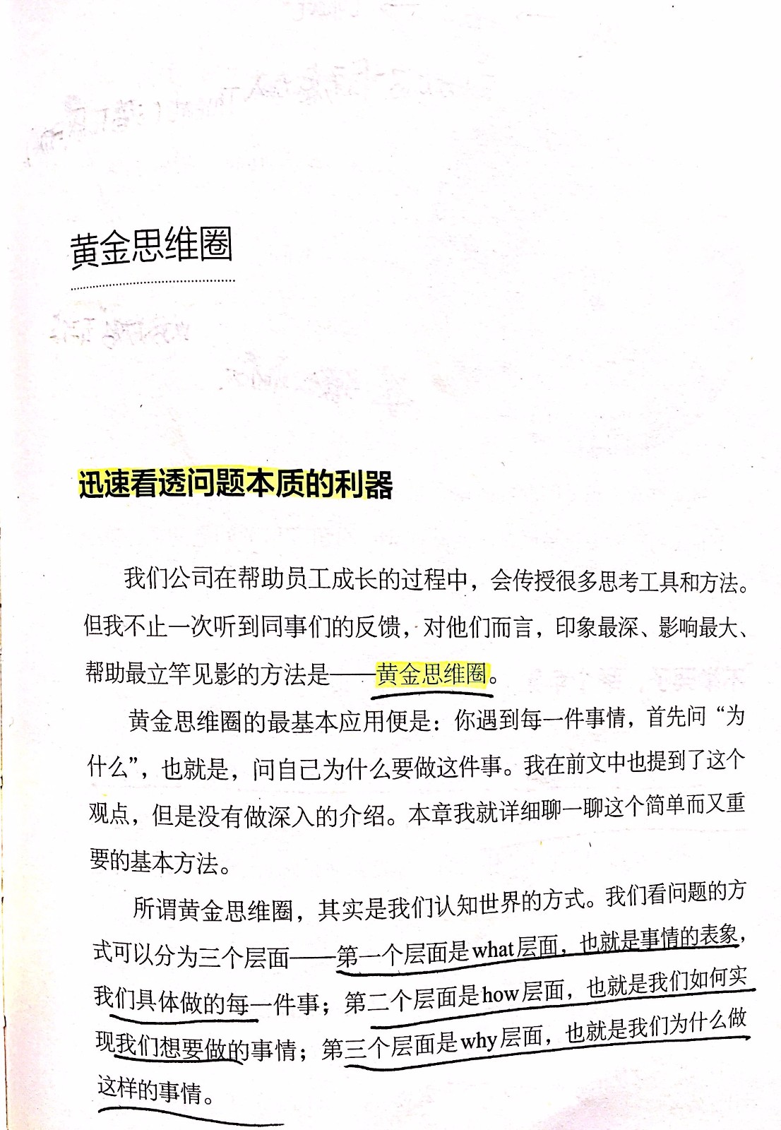 【什么是黄金思维圈】那么我在这里画了一幅图来帮助大家理解这个片段。黄金思维圈其实是我们认知世界的方式,我们看问题的方式可以分成3个层面,分别是what,how,why这三个层面,我们大部分人平常在思考的时候都是从what层面去思考问题,黄金思维圈是希望我们能从why的层面去思考问题。