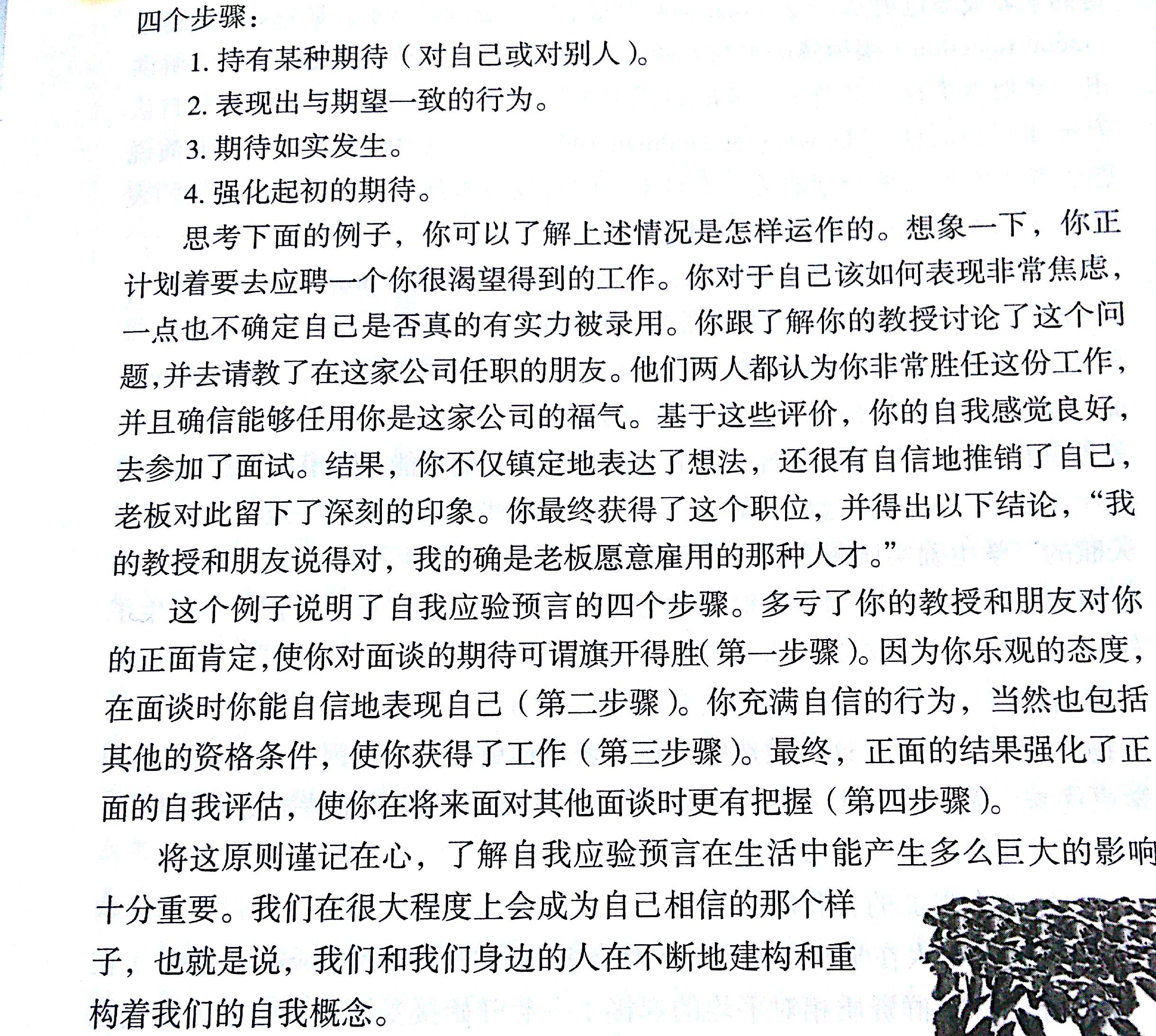 我认为自我应验预言循环的前三步比较重要。我之前再做一个练习就是每天坚持一次冥想。我之所以会做是因为身边的人经常和我说这个很好,还有一个原因是这个课程不用很长时间,每天只要10分钟只要坚持40天就可以了。但是当我坚持到20天的时候,我开始厌倦冥想。当时放弃了的时候我心里还是蛮懊恼的。不过我想过以后我觉得是我一开始没有想清楚我的有所想到底是尝试练习还是坚持一件事。我以为我想要坚持一件事情,但是我表现出来的确实我尝试了就好了。我觉得我可能有所得以后就不会在进行强化了。