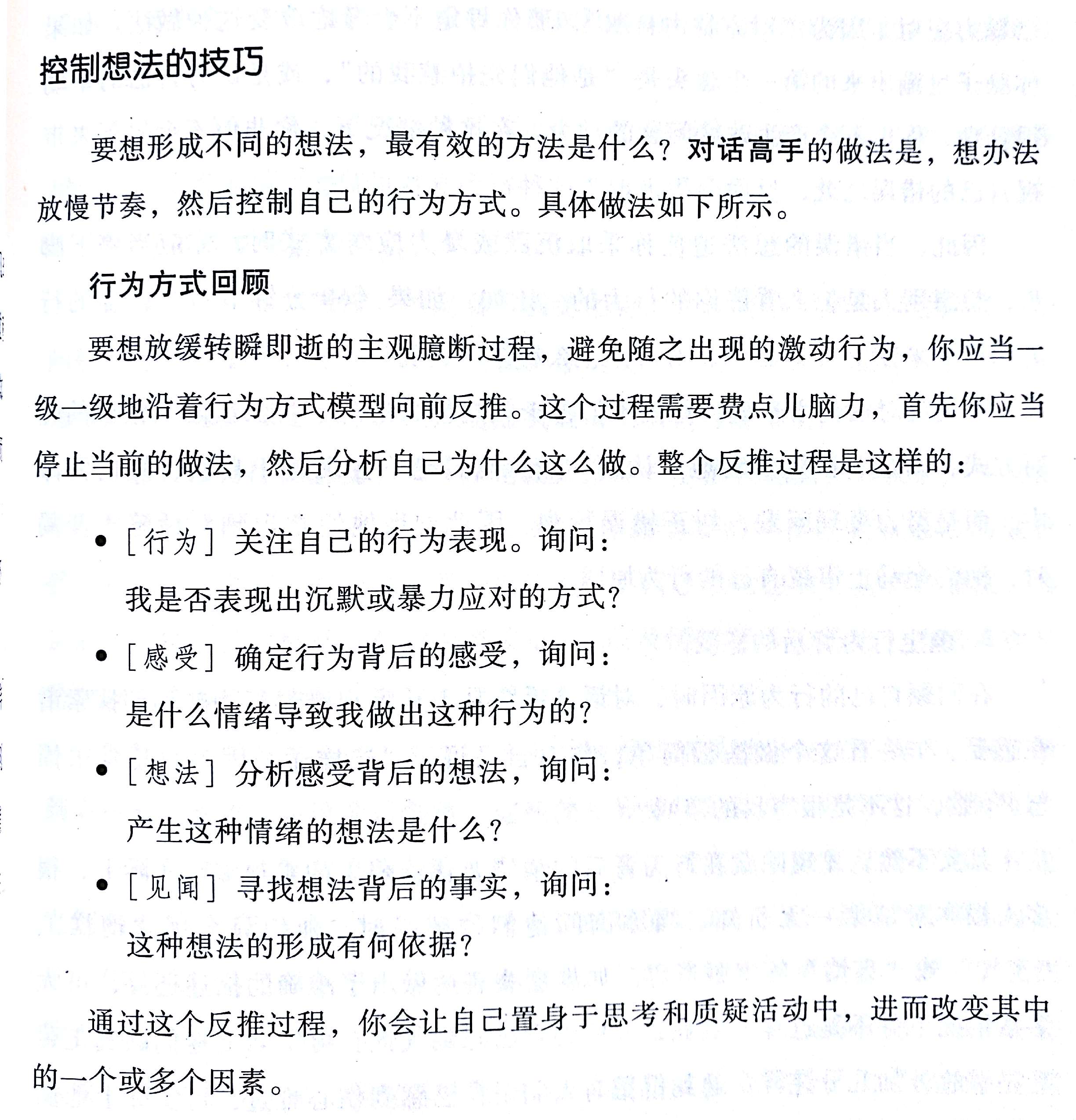 《关键对话》这本书提炼出了行为方式模型,并给出了反推方法。跟随我本次完成RIA后,学习者能够了解情绪产生的原因,并通过行为方式模型反推,洞察自己的想法和感受,由此来控制自己的行为。坚持下去,对于