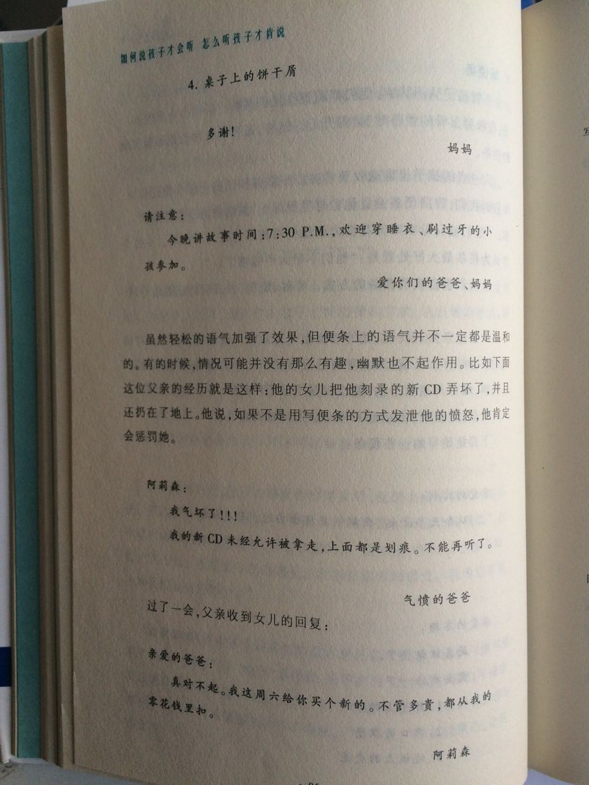 不论大一点的孩子还是小一点的孩子,都喜欢收到便条。因为收到便条他们觉得就像收到远方朋友的来信,感觉受到重视,并被父母的这种行为打动,而且避免了听到父母的嚷嚷。家长们也喜欢写便条,因为写便签不但比用最喊要奏效,而且方便、快捷,还可以收藏回味。