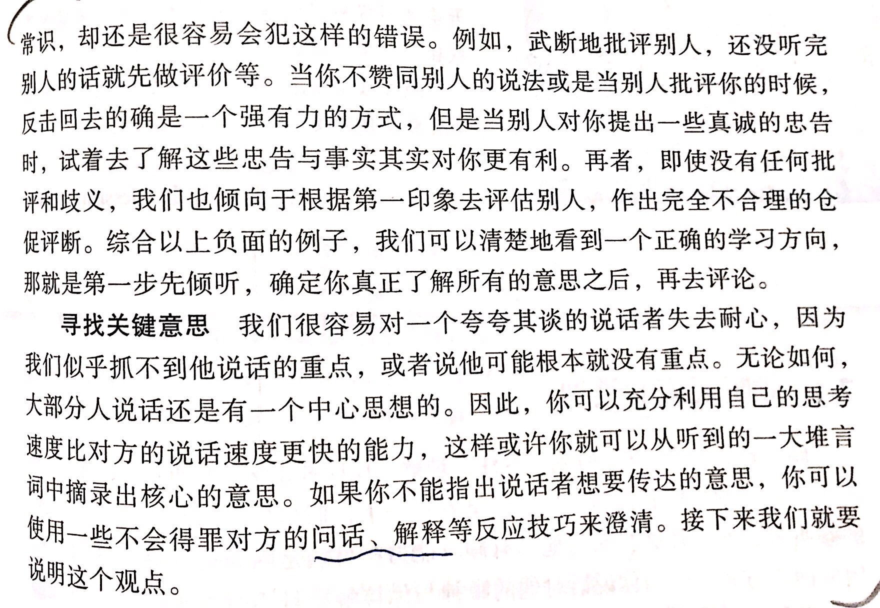 [解决]那需要怎么解决这样的问题呢?答案就是:学会有效的倾听,在《沟通的艺术》这本书中,我们会学如何做到有效倾听,其中行之有效的方法帮助我们快速成为善于倾听的人。
