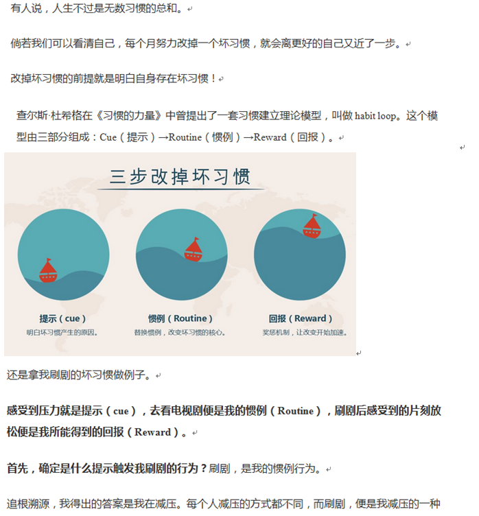 这就是改变坏习惯三步骤:1、找到触发点;2、替换原来的行为;3、及时奖励。