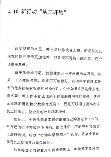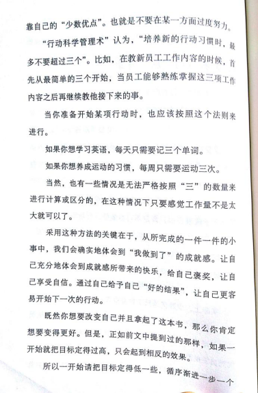 行动科学管理术认为,培养新的行动习惯时,最多不要超过三个。如果不那么做的话,可能我们会很快就放弃自己本打算坚持的行动。例如,减肥,如果一开始我就每天跑5公里,那么也许我第二天就会因为太过于困难而放弃。也就是在最开始的时候,我们把目标定的小一些,然后循序渐进。