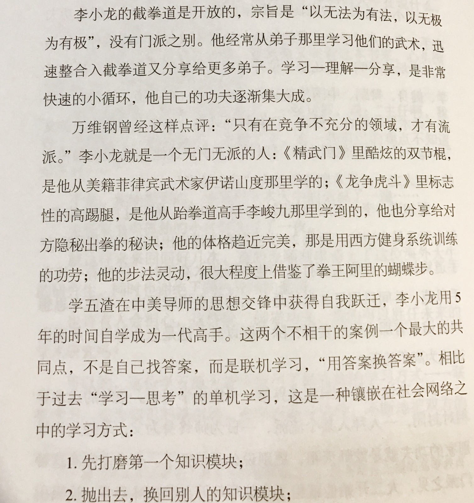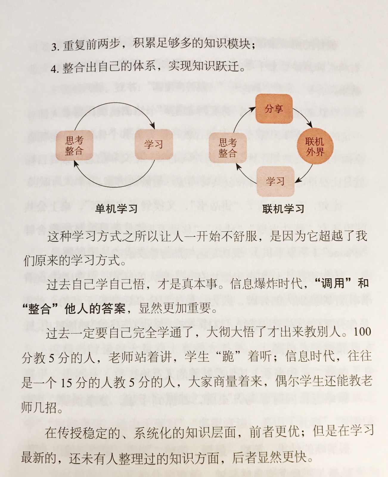 我们传统学习模式是比较单向的,是思考学习,自己一个人琢磨,就像打单机游戏,没有任何的交流和反馈。那么今天这个片段它强调的是联机学习,先学会其中一块的知识,掌握,迅速与他人分享交流,获得及时反馈的同时,也获得他人学习的知识模块,整合到自己的知识体系中,加速学习的进程。