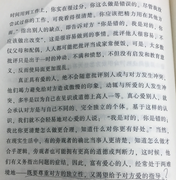 I:片段开头说的爱的冲突,实际就是指向亲人朋友提出批评。作者在第一段说批评的实质或潜台词其实就是什么?对,“你是错的,我是对的。”文中还提出了一个矛盾。真正的爱是承认和尊重对方的不同和独立性,不把自己的想法强加于对方。但是有些时候,尤其是我们面对自己的孩子,弟弟妹妹,学生,后辈等人的时候,针对某一件事情,经过反思,我们确认自己很有可能是正确的,于是我真的很想给予他们指导,只求他们能更好。大家会有这样的困惑或者是矛盾吗?