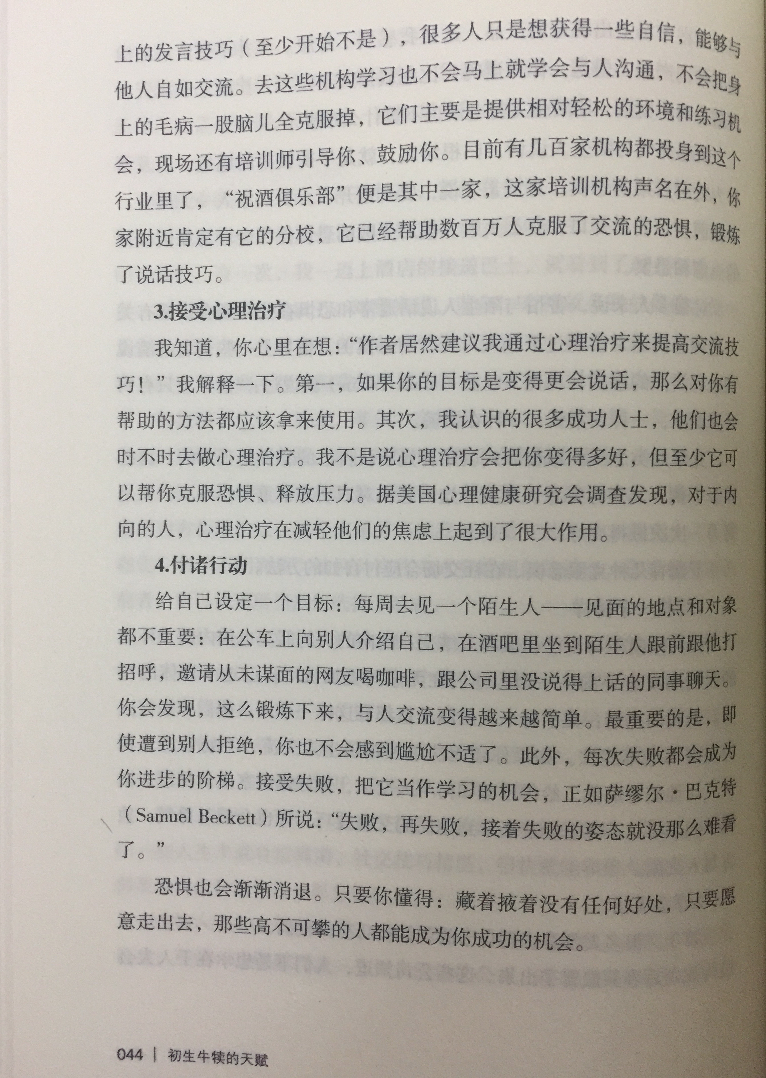 在生活中我也给自己定个小目标来实践今天分享的内容。下周一我要出差上海,我的目标是客服心里的恐惧,在候机室找一个陌生人聊天。我会跟他说你好:“你好,我可以坐下吗?”然后跟他介绍我自己,并了解跟对方交谈,互相交换名片或者微信号。