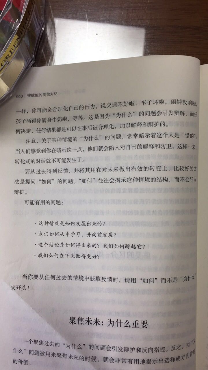 应用“如何”来代替“为什麽”,我们需要注意的是,这并不是一个万能钥匙,这种方法仅仅适用于询问过去发生的事,从过去发生的事中得到有价值的反馈。并不适用于聚焦于未来。