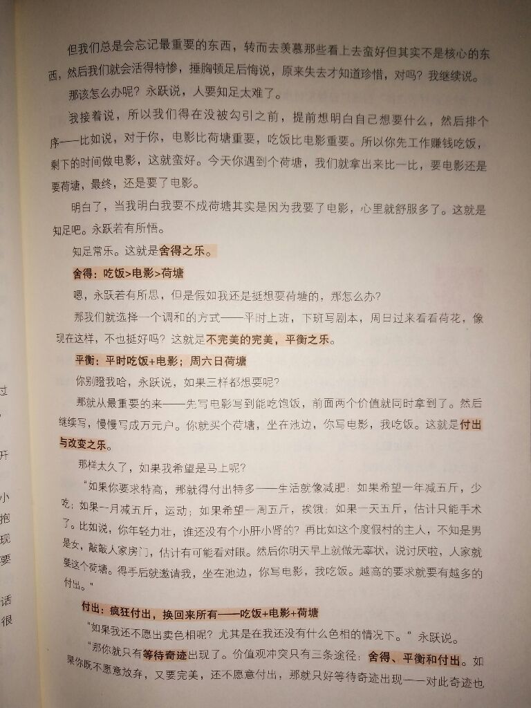 A1:看到这个片段,我瞬间就感觉到了自己躺枪了,众所周知我的书很多,这不算即时享乐,我的即时享乐更多体现在吃,比如刚刚开工资,就想去吃顿好吃的,在电商网站看到秒杀便宜,就会动用花呗或者白条去把东西先买到手里。而当手里没钱的时候,买一个雪糕自己都觉得很奢侈。这都是自己敌不住诱惑,又不能很好掌控自己造成的。然后到还款的时候就会很痛苦,从而进入了一个恶性的循环。标题中的“活在当下”是指有计划的活在当下,而不是什么都不考虑,不顾一切的活在当下。