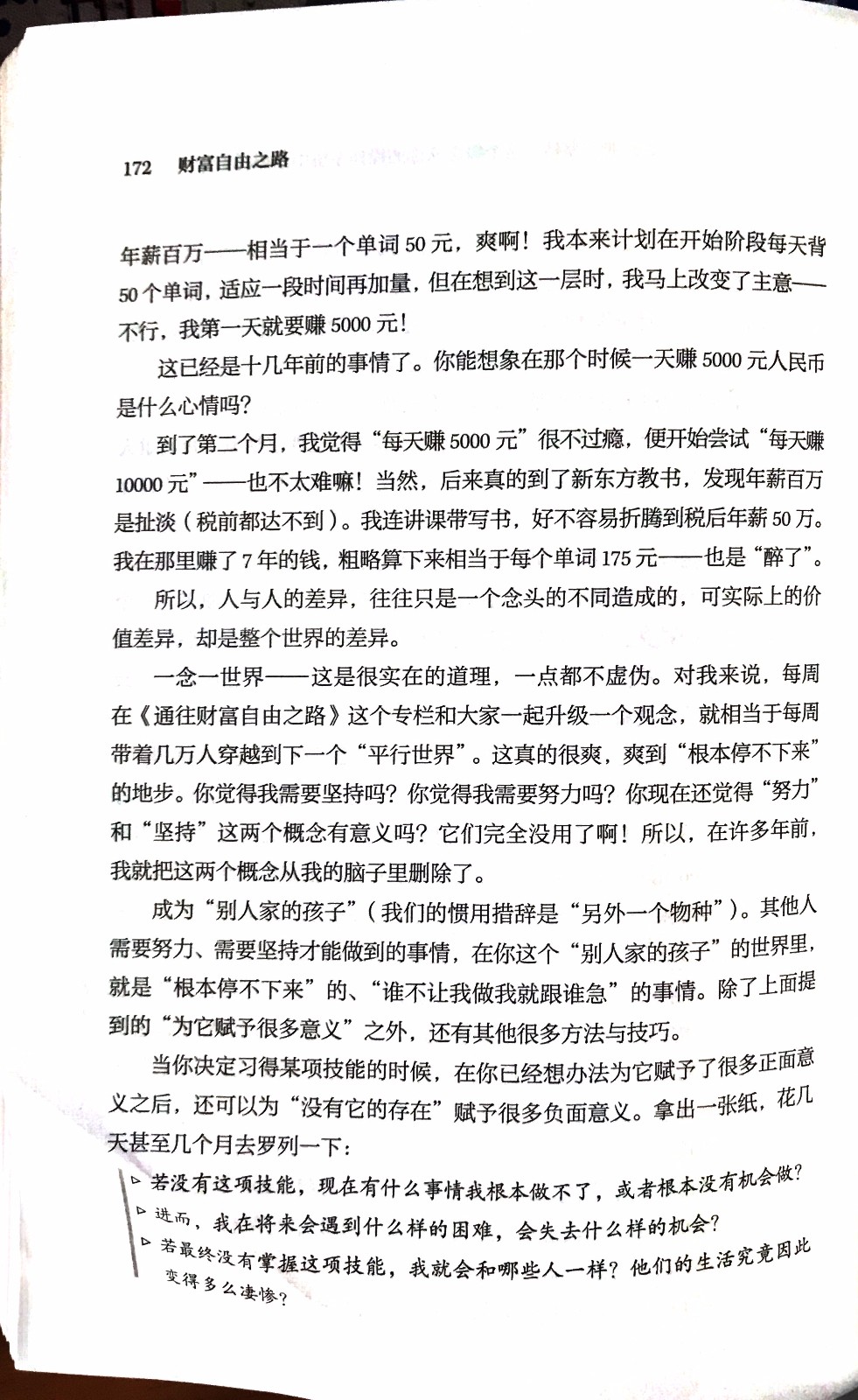 〔使用FAB技能〕(F)特征(核心是书用于满足好奇心)《通往财富自由之路》作者李笑来。他是著名天使投资人,中国比特币首富,原新东方名师。年纪轻轻便实现了自己的财富自由。本书沉淀了李笑来老师多年的人生思考、经验与智慧。 (A)优势(重点是“比较”用于建立安全感) 本书帮助大家认清自己的“操作系统” ,没有说教,没有废话,只有进步的方法论、实践的细节。在得到APP上的专栏已帮助17万人更好地优化前进的路线。 (B)利益(强调学习者,用于激发兴趣)该书讲述了在通往财富自由之路上,一定要问自己的50个问题,重塑概念,打造全新的自己。指导我们自身找到一条可以看到见、做得到的成长之路,告诉大家一个朴素的真理“财富要自由,自己先成长”!