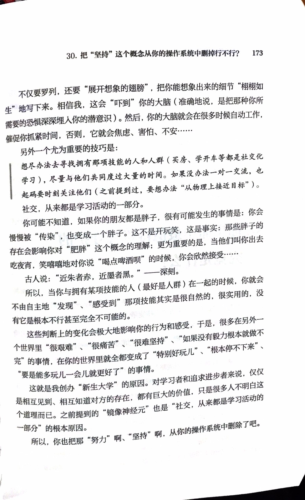 (why)(不这样做的坏处) 在习得新技能、培养新习惯的过程中,如果没有赋予重大意义,内在的持续力将会不足;如果没有赋予负面意义,内在的驱动力将不足;如果没有通过社交方式学习,外部环境的激发与认同将不足;最后,我们会发现自己积攒的能量不够,轻易会半途而废。