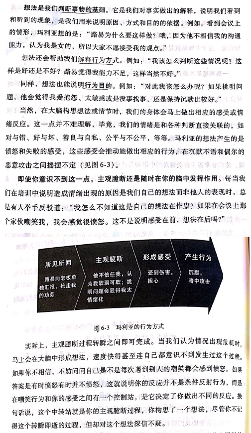 这个片段向我们介绍了一个行为方式模型:我们看到和听到事实会让我们产生想法。想法让我们产生情绪和感受,而情绪和感受又会推动我们作出相应的行为。所以导致我们产生情绪的原因不是别人的行为表现,而是我们自己的想法。