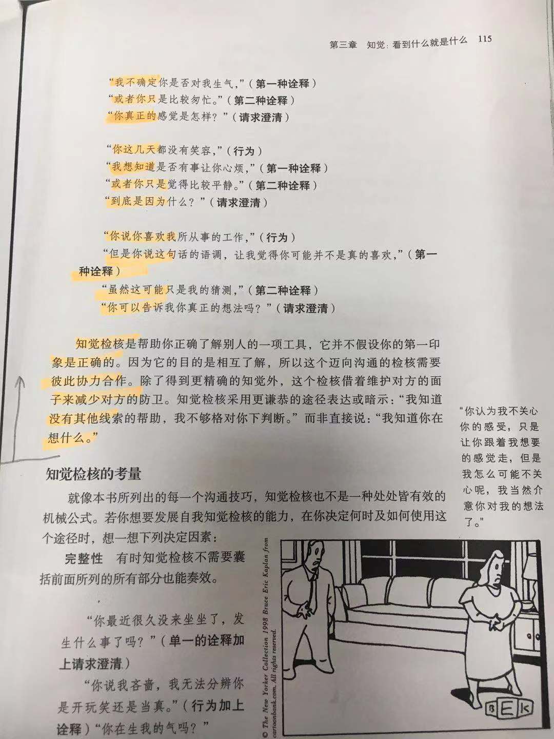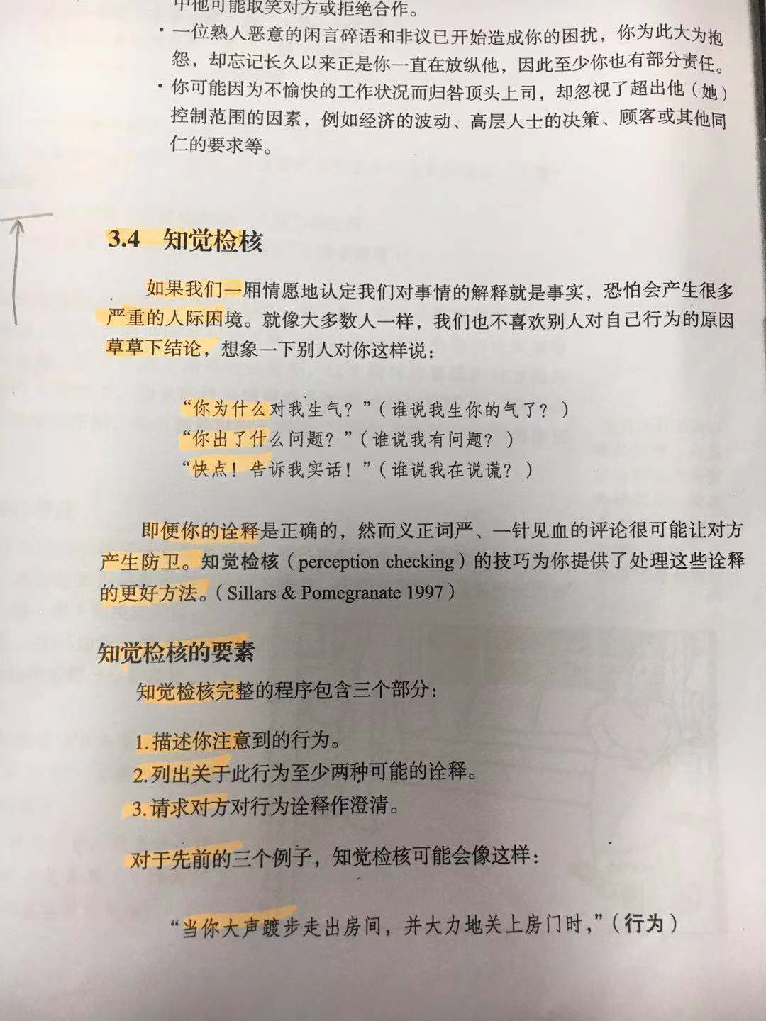1)讲客观行为 2)列两种诠释 3)请对方澄清 ,很多情况下我们常把自己的猜测当作唯一事实而引起人际困境。知觉检核就可以避免。