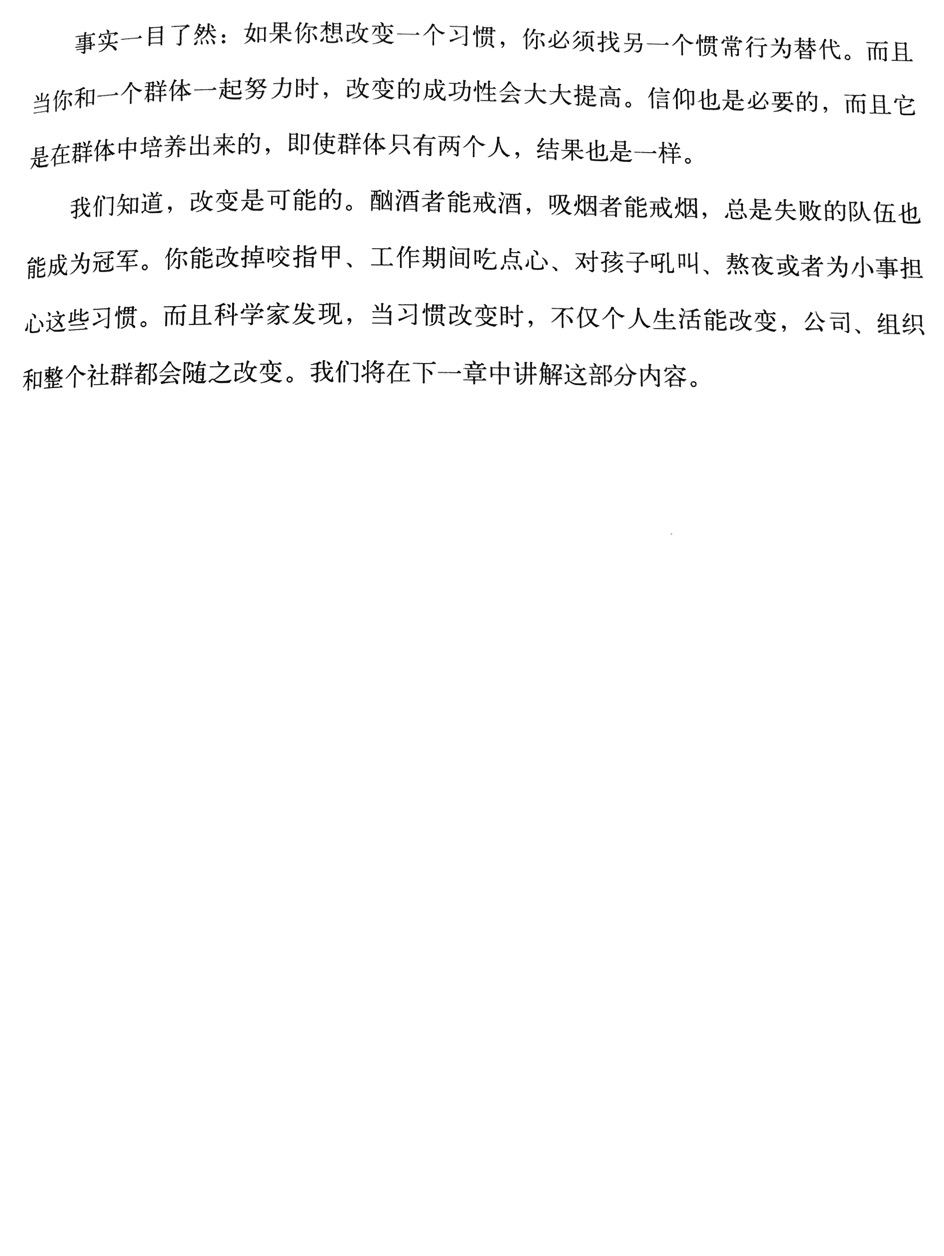 从第一个片段我们知道习惯已经在我们的大脑里形成了神经回路,所以如果我们纯用意志力去抑制习惯是不可能的,但是我们可以用第二个片段里的方法将坏习惯替换掉。大家能找到这个方法是什么吗?首先,我们要找到旧习惯的暗示、奖赏是什么(找到暗示、惯常行为、奖赏的方法在第一个片段已经讲了);然后,保留原来的暗示和奖赏,植入一种新的惯常行为;最后,找一个可以提供帮助的团体,哪怕这个团体只有两个人,团体不仅可以提供监督,更因为在团体的帮助下,我们更容易相信改变是可能的,也就是片段里提到的信仰。