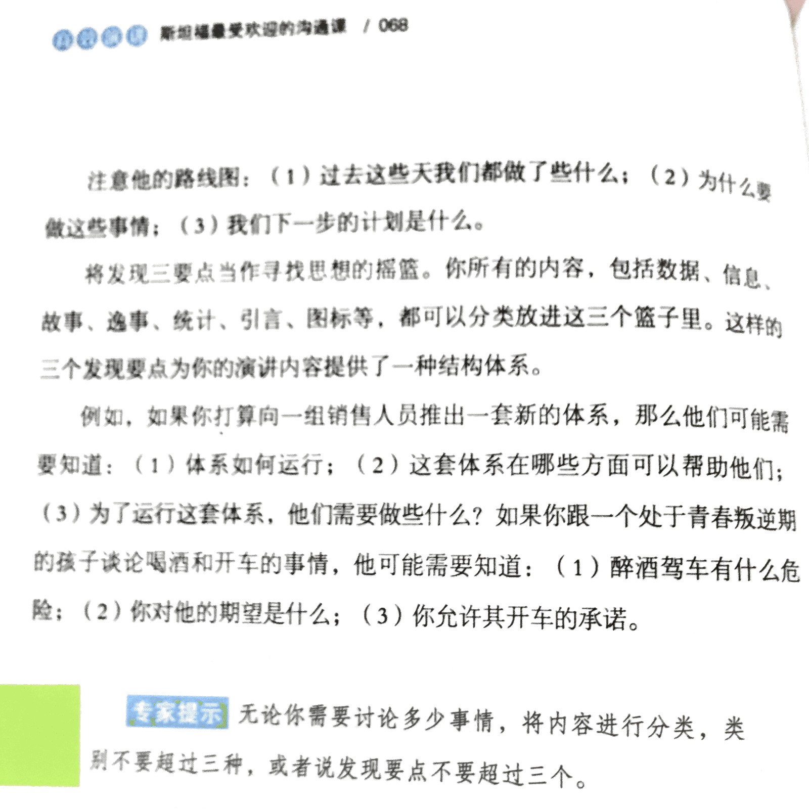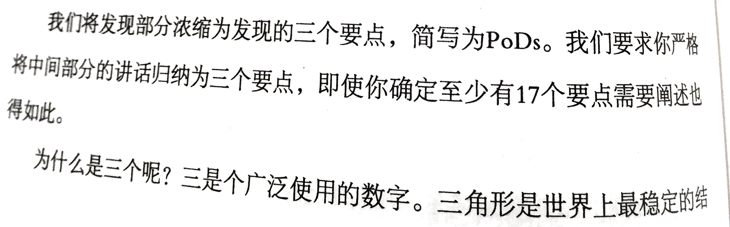 | 拆书家提问设计(逐字稿):那如果用上“三个要点”原则,仔细想一想,如何将你的观点分成三类? 请大家在小组内每个人分享一个最近遇到的例子,先说一说当时是怎么表达的,再想一想,用三个要点原则,重新表达,你怎么说?说完以后,请大家把你的分类方法也说出来。 |