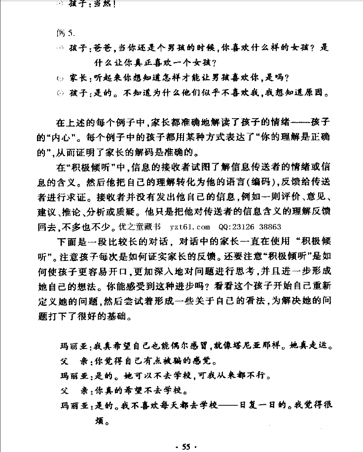 提问:这是积极倾听吗?回答:不是。这是说教。积极倾听是直接反馈感受,比如“你不想上学了,是吗?”