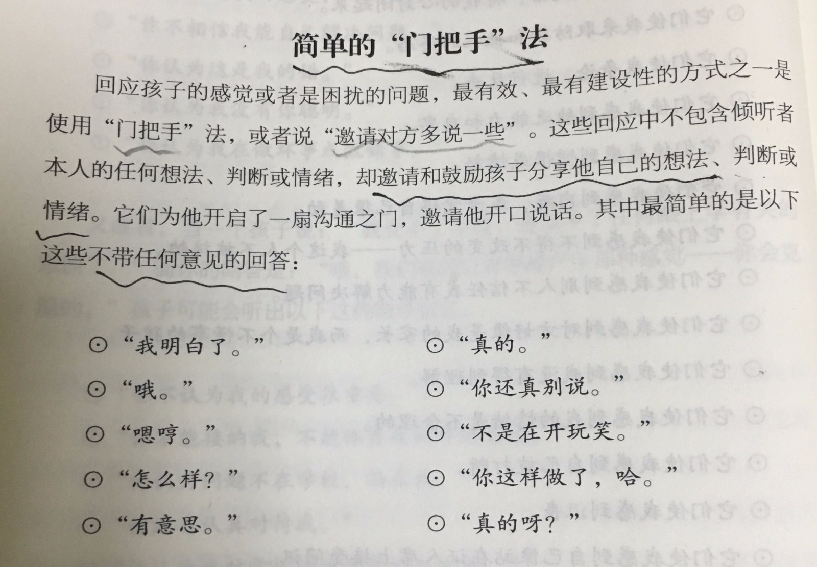 What:回应孩子的感觉或者是困扰的问题,最有效、最有建设性的方式之一是使用门把手法,或者说“邀请对方多说一些”。