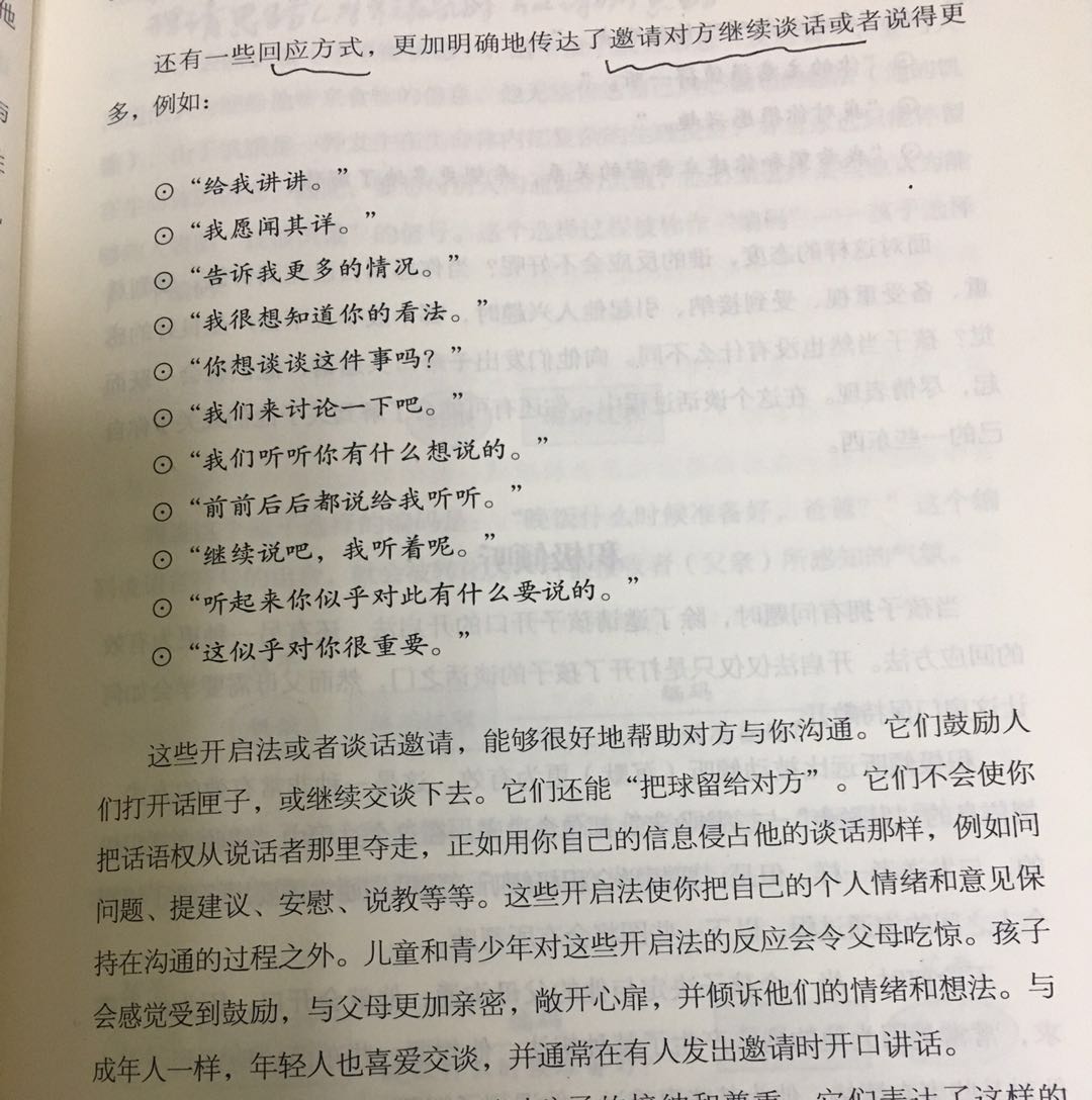 Why:带着好奇心去倾听,鼓励对方打开话匣子,把话语权给对方,把自己的个人情绪和意见保持在沟通过程之外,孩子会感受受到鼓励,从而敞开心扉,倾诉他们的情绪和想法。