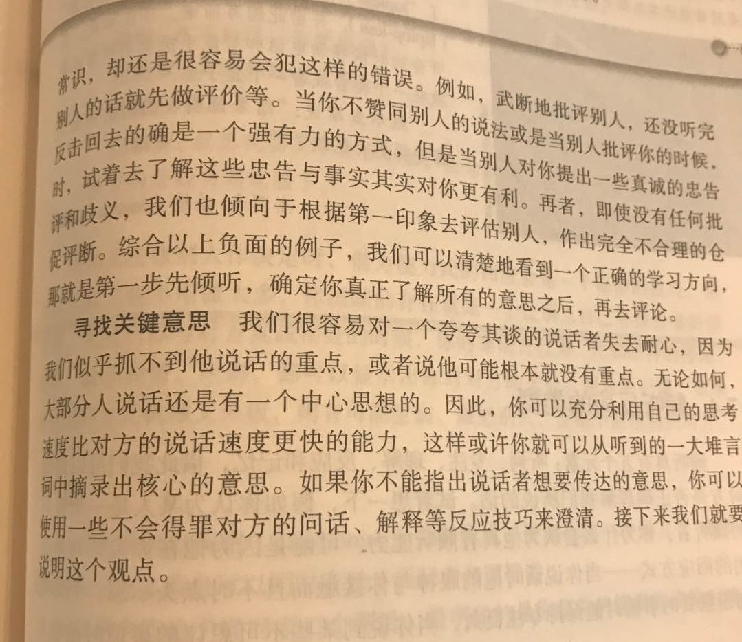 沟通中一个情景是你说我听,因此“听”是非常重要的。掌握正确的倾听姿势,可以在日常沟通中快速抓住对方表述中的关键意思,并能及时给出正确的反馈。我们来一起看下的拆页片段 ,我用方框圈起来的部分,时间2分钟,阅读完请以眼神示意我,谢谢。