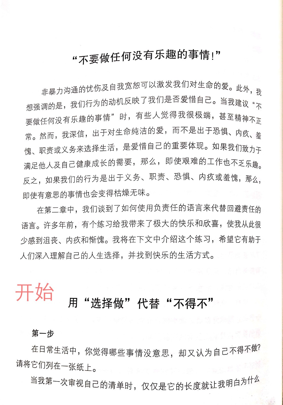 大家好,我是佳音。本次我的拆页来自这本非常有名的《非暴力沟通》。它指导我们转变谈话和聆听的方式,有意识地使用语言。让我们在每次互动中,都能聆听到自己和他人心灵深处的呼声。应用非暴力沟通法可以改善我们的人际关系,改进工作交流,协调各大个层面的争论和冲突。还可以用它进行自我了解,善待我们自己。如果你希望提高自己的沟通能力,这本书一定不能错过。今天的片段就是一个关于善待自己的运用,教我们如何积极面对那些感觉没意思又“不得不”去做的事情。