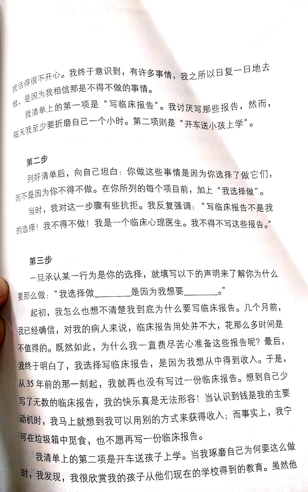 举例:为了便于大家理解,我举一个我自己的例子。我家住南泉,属于郊区,我每天上下班路上时间总共要三小时。每天需要早起,高峰时间人很多又挤又吵。所以这件事情对我而言就是一件没意思但是又”不得不”去做的事情。然后我就使用了这个方法进行自我对话,写下这件事后,我告诉自己确实没有人强迫我,这的确是我自己的选择。接着问自己为什么每天坐这么久的车都要去上这个班?我回答自己那是因为家附近没什么工作机会,而我想做一份适合自己的工作,不想委屈自己干不想干的事情。还因为我想要跟外面的人有链接有交流,保持进步,不想封闭在里面做村姑。静下心来后我又找到更多的好处,比如车上时间是一个没人打扰的连续时间,而且几乎不需要消耗专注力,可以用于学习和思考,带上耳机听先上课就很不错。想明白后我就非常珍惜我的通勤时间,甚至周末没这几个小时的无干扰时间,我还会觉得很可惜。
