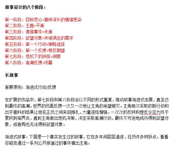 故事的八个阶段:1、目标受众。2、主题。3、激励事件。4、欲望对象。5、第一个行动。6、第一个反馈。7、危机下的抉择。8、高潮反馈。