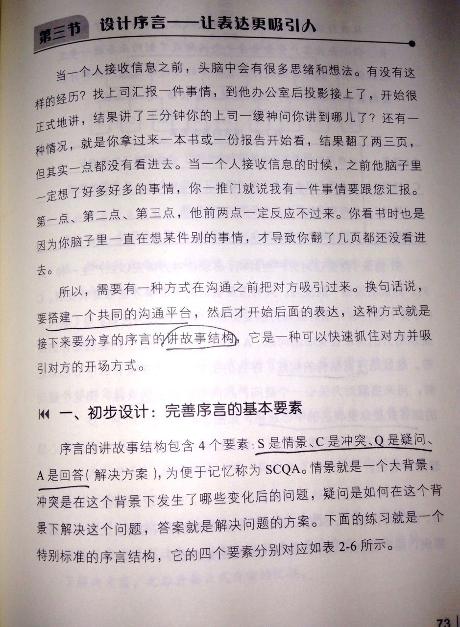 片段给大家带来了一个快速吸引人的开场结构——SCQA结构。S是情景,目的是让对方产生共鸣;C是冲突,是让对方从熟悉的东西里感觉到“危机感”;Q是疑问,是根据前面的冲突从对方的角度提出他所关心的问题;最后A就是解答,是对前面Q的解答,同时也是你接下来要表达的中心思想。整个结构下来,其实是先说容易被认同的事情,形成良好的沟通氛围,再带入冲突就容易了,我将之总结为“先跟后带”的方式。除了在片段里面提到的例子,不知道大家有没有发现,阅读前我所说的一句话,也是用到了这样的一个结构。S:我们总是很多想法要表达,向上司陈述工作,向爱人述说爱意……,这是情景,大家都会遇到并且熟悉的情景;C:但往往你已经滔滔不绝讲了3分钟……这是在前面情景基础上的冲突,这里,通常会出现“但是”、“然而”一类的转折副词;Q:有没有一种方式可以快速吸引对方,这是疑问;A:接下来将要学习的片段设计序言。大家有被我快速地吸引到了吗?