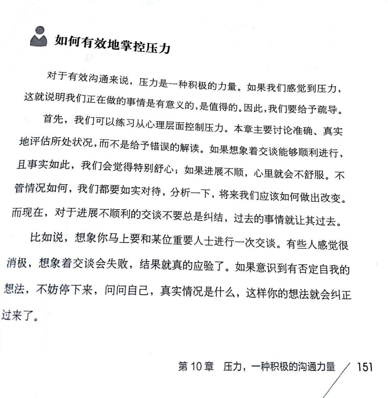 接下来我讲一下我对这个片段的理解:在生活中,我会听到很多人说今的社会是一个浮躁的社会,我想很多人都有这样的感受。因为很多人想要追求过多的东西,会把自己弄得很忙,从而形成了我们身上的压力。在生活中我们常常会听到有人说:压力山大,我感觉我都快崩溃了;或者是压力好大呀,我都不知道该怎么做了等等之类的话。在生活中我们也会经常听到这样的话:有压力才有动力嘛!但是事实上呢,却有很多人因为压力过大而心力交瘁,力不从心。可是我们该怎么做呢。别担心,书里面给我们提供了三个方法,让我们有效的掌控压力: