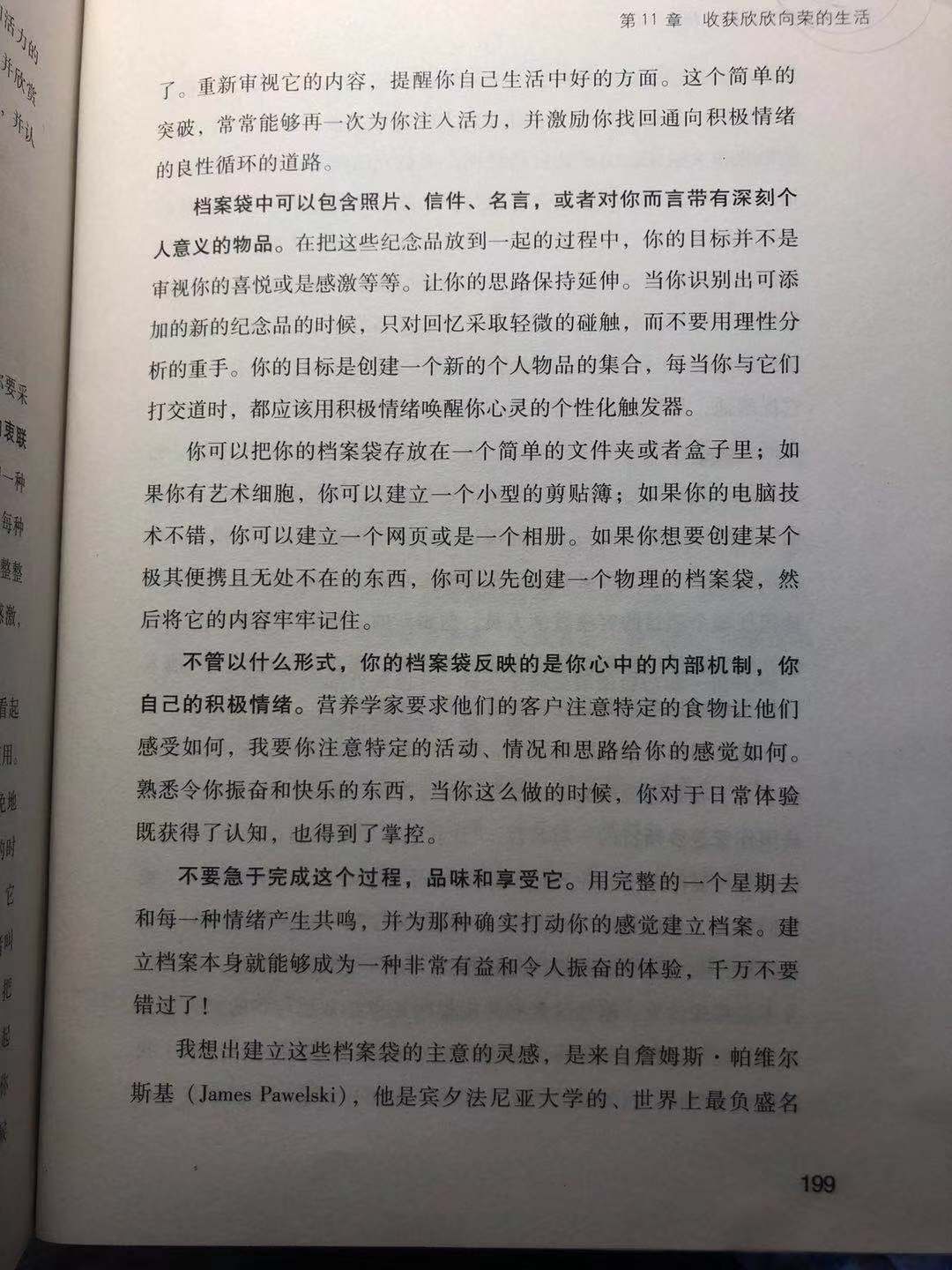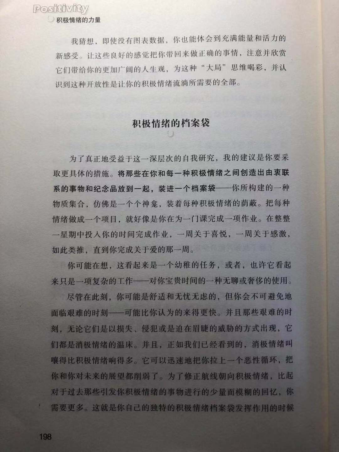 在拆页中,作者给出了一个创造积极情绪的方法,为每一种积极情绪制作档案袋,当你被消极情绪拉入泥潭的时候,可以拿出这个档案袋来保护自己,重燃生活的热情,找回自己的积极情绪。